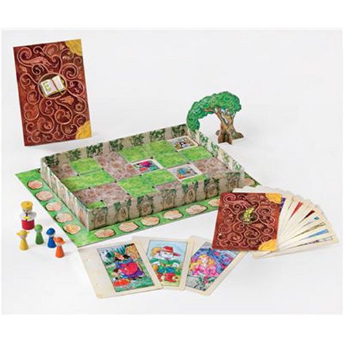 Inhalt: 1 Spielpan (34 x 23 x 4,5 cm), 24 Märchenplättchen, 21 Gartenplättchen, 4teiliger Laufweg, 14 Märchenbuchseiten, 1 Kordel, 1 Kirschbaum, 4 Spielfiguren, 1 König, Spielanleitung und dazu das Märchen „Der Märchenschatz“